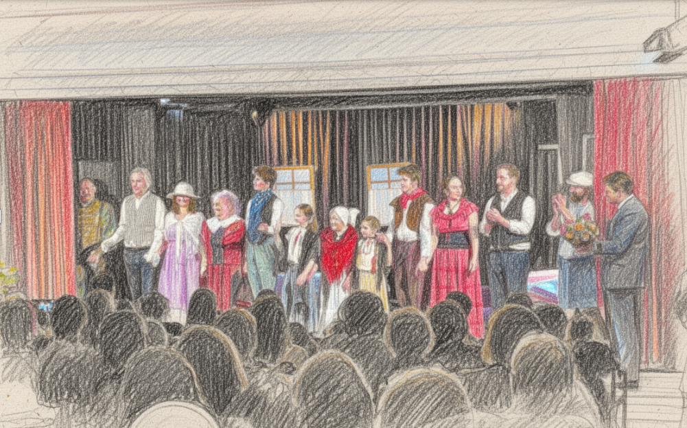 Po včerejším představení si diváci neskrytě vyžadují reprízu a pořádají sbírku na založení velkého divadla v Jirnech....